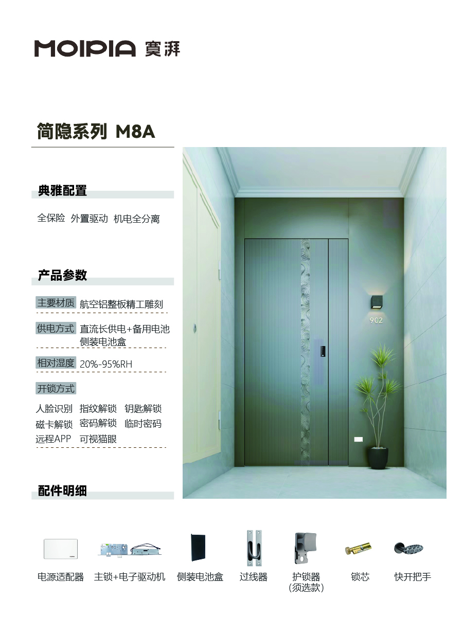典雅配置 全保险 外置驱动 机电全分离 产品参数 主要材质:航空铝整板精雕工雕刻 供电方式:直流长供电 + 备用电池 侧装电池盒 相对湿度:20%-95% RH 开锁方式:人脸识别 指纹解锁 钥匙解锁 磁卡解锁 密码解锁 临时密码 远程 APP 可视猫眼