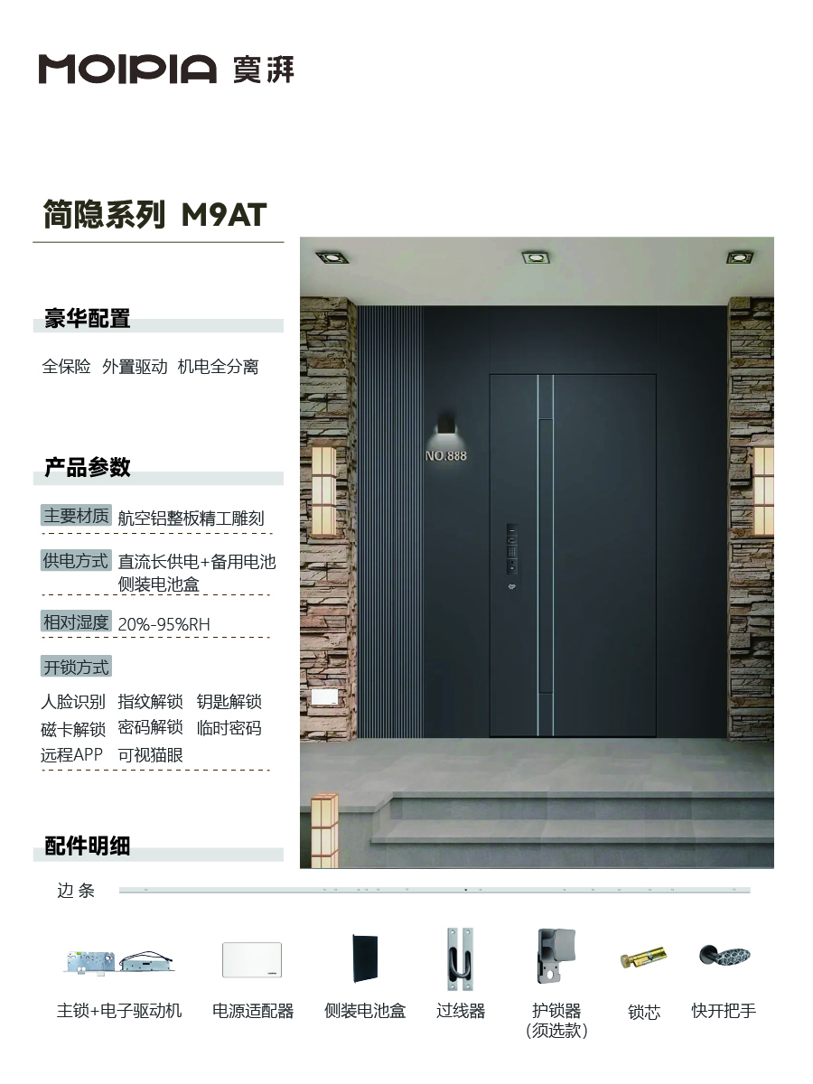 豪华配置 全保险 外置驱动 机电全分离 产品参数 主要材质:航空铝整板精工雕刻 供电方式:直流长供电 + 备用电池 侧装电池盒 相对湿度:20%-95% RH 开锁方式:人脸识别 指纹解锁 钥匙解锁 磁卡解锁 密码解锁 临时密码 远程 APP 可视猫眼