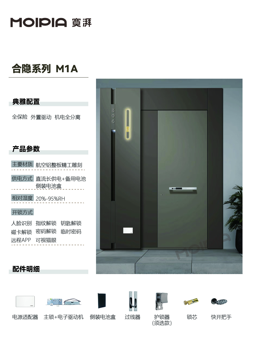 典雅配置 全保险 外置驱动 机电全分离 产品参数 主要材质:航空铝整板精工雕刻 供电方式:直流长供电 + 备用电池 侧装电池盒 相对湿度:20%-95% RH 开锁方式:人脸识别 指纹解锁 钥匙解锁 磁卡解锁 密码解锁 临时密码 远程 APP 可视猫眼