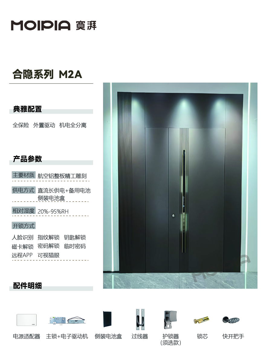 典雅配置 全保险 外置驱动 机电全分离 产品参数 主要材质:航空铝整板精工雕刻 供电方式:直流长供电 + 备用电池 侧装电池盒 相对湿度:20%-95% RH 开锁方式:人脸识别 指纹解锁 钥匙解锁 磁卡解锁 密码解锁 临时密码 远程 APP 可视猫眼