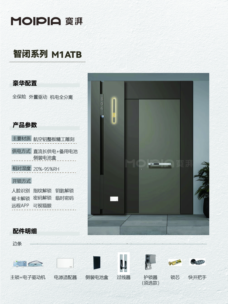豪华配置 全保险 外置驱动 机电全分离 产品参数 主要材质:航空铝整板精工雕刻 供电方式:直流长供电 + 备用电池 侧装电池盒 相对湿度:20%-95% RH 开锁方式:人脸识别 指纹解锁 钥匙解锁 磁卡解锁 密码解锁 临时密码 远程 APP 可视猫眼