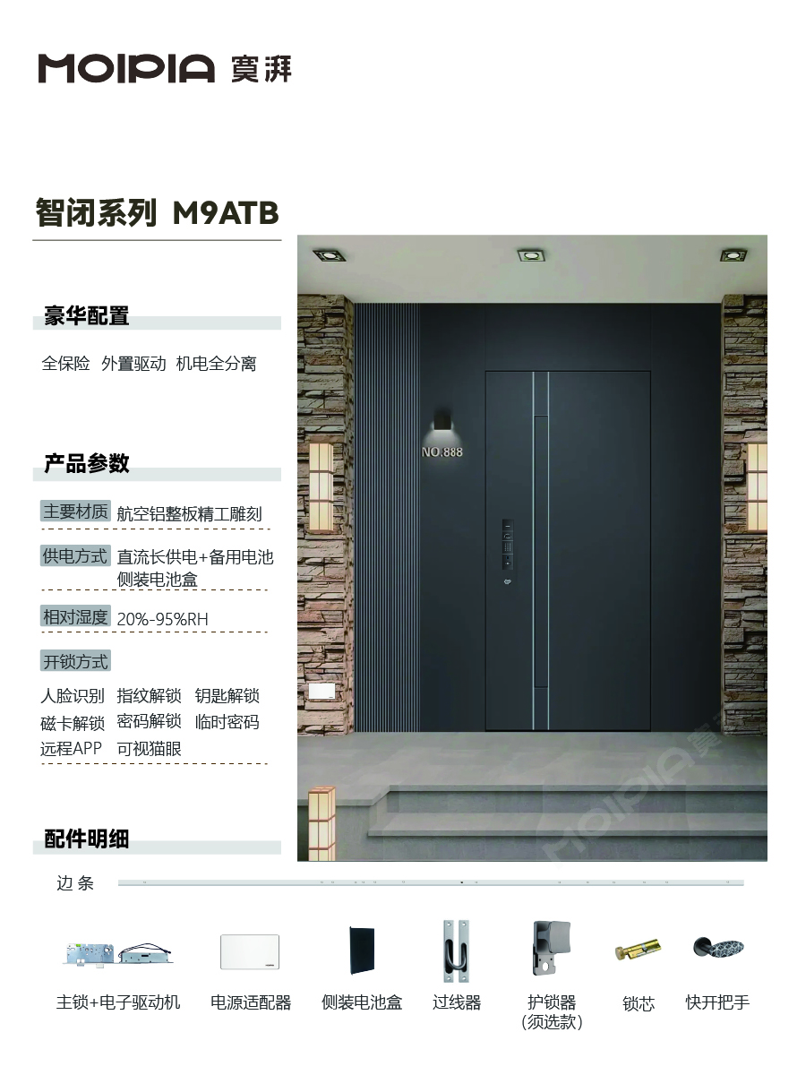 豪华配置 全保险 外置驱动 机电全分离 产品参数 主要材质:航空铝整板精工雕刻 供电方式:直流长供电 + 备用电池 侧装电池盒 相对湿度:20%-95% RH 开锁方式:人脸识别 指纹解锁 钥匙解锁 磁卡解锁 密码解锁 临时密码 远程 APP 可视猫眼