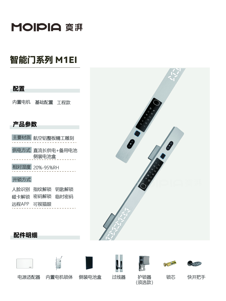 配置 内置电机 基础配置 工程款 产品参数 主要材质:航空铝整板精工雕刻 供电方式:直流长供电 + 备用电池 侧装电池盒 相对湿度:20%-95% RH 开锁方式:人脸识别 指纹解锁 钥匙解锁 磁卡解锁 密码解锁 临时密码 远程 APP 可视猫眼