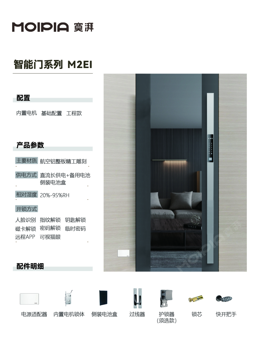 配置 内置电机 基础配置 工程款 产品参数 主要材质:航空铝整板精工雕刻 供电方式:直流长供电 + 备用电池 侧装电池盒 相对湿度:20%-95% RH 开锁方式:人脸识别 指纹解锁 钥匙解锁 磁卡解锁 密码解锁 临时密码 远程 APP 可视猫眼