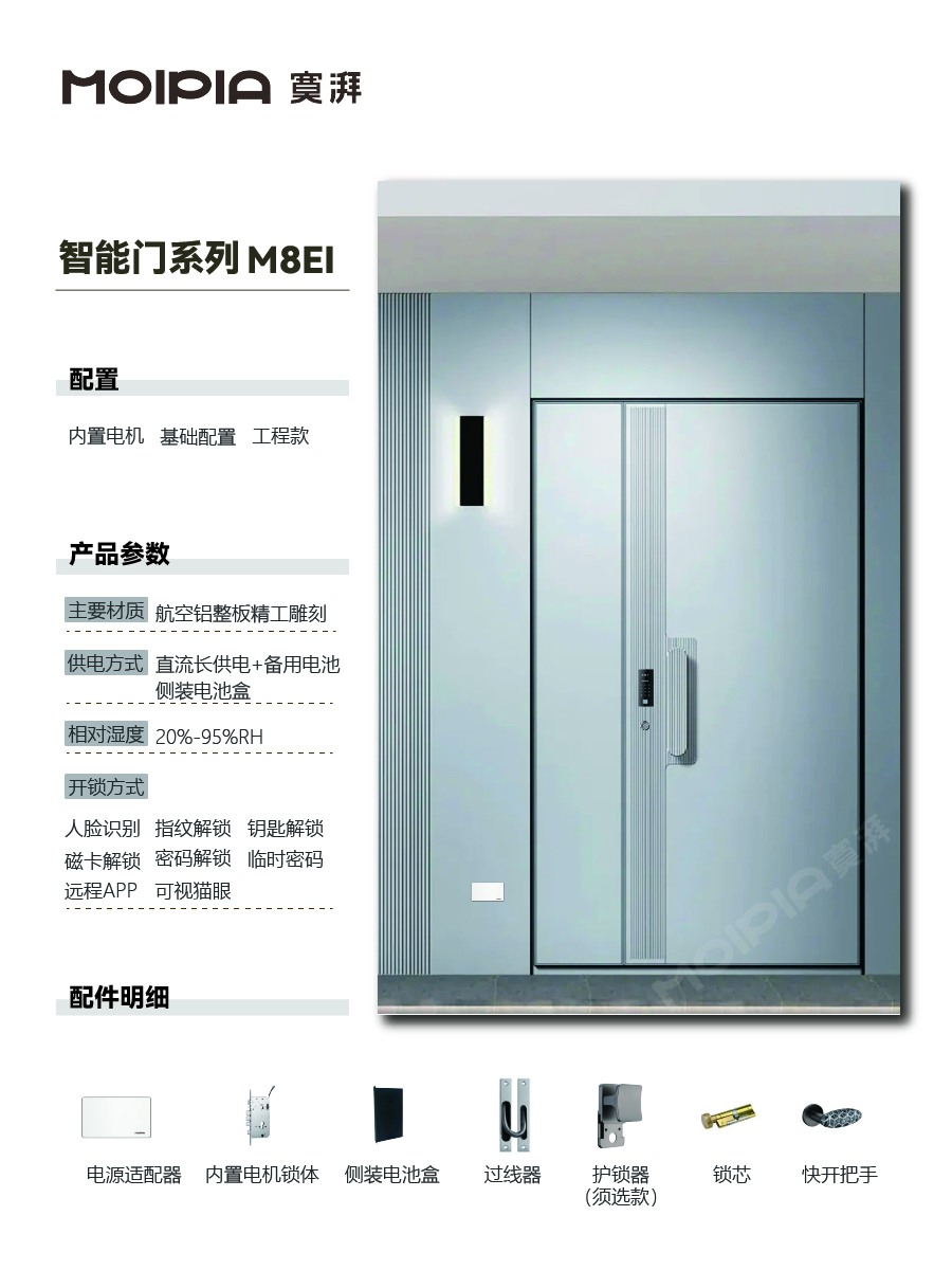 配置 内置电机 基础配置 工程款 产品参数 主要材质:航空铝整板精工雕刻 供电方式:直流长供电 + 备用电池 侧装电池盒 相对湿度:20%-95% RH 开锁方式:人脸识别 指纹解锁 钥匙解锁 磁卡解锁 密码解锁 临时密码 远程 APP 可视猫眼