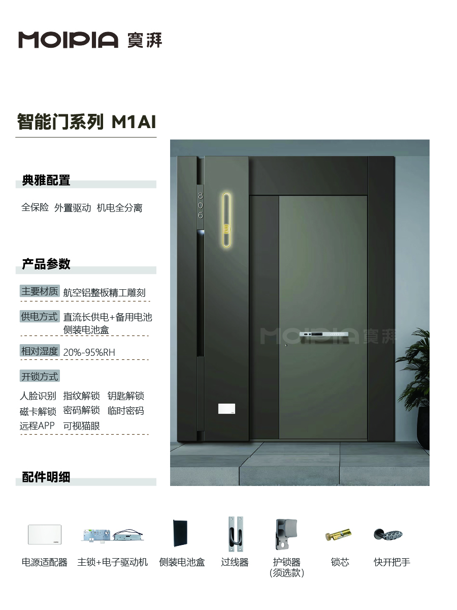 典雅配置 全保险 外置驱动 机电全分离 产品参数 主要材质:航空铝整板精工雕刻 供电方式:直流长供电 + 备用电池 侧装电池盒 相对湿度:20%-95% RH 开锁方式:人脸识别 指纹解锁 钥匙解锁 磁卡解锁 密码解锁 临时密码 远程 APP 可视猫眼