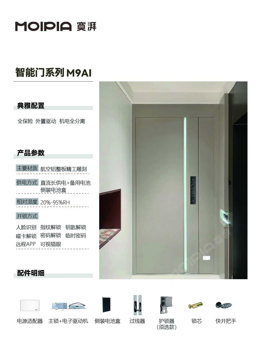 典雅配置 全保险 外置驱动 机电全分离 产品参数 主要材质:航空铝整板精工雕刻 供电方式:直流长供电 + 备用电池 侧装电池盒 相对湿度:20%-95% RH 开锁方式:人脸识别 指纹解锁 钥匙解锁 磁卡解锁 密码解锁 临时密码 远程 APP 可视猫眼