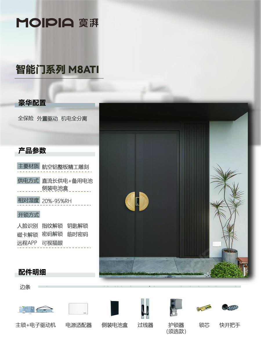 豪华配置 全保险 外置驱动 机电全分离 产品参数 主要材质:航空铝整板精工雕刻 供电方式:直流长供电 + 备用电池 侧装电池盒 相对湿度:20%-95% RH 开锁方式:人脸识别 指纹解锁 钥匙解锁 磁卡解锁 密码解锁 临时密码 远程 APP 可视猫眼