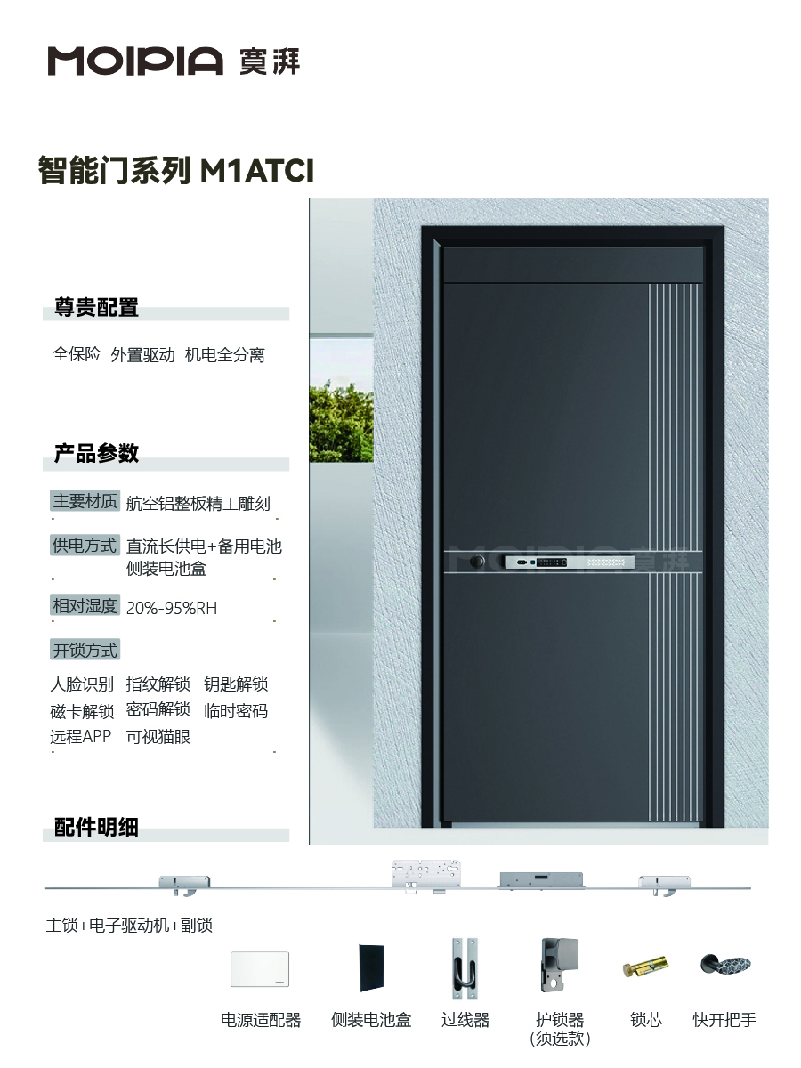 尊贵配置 全保险 外置驱动 机电全分离 产品参数 主要材质:航空铝整板精工雕刻 供电方式:直流长供电 + 备用电池 侧装电池盒 相对湿度:20%-95% RH 开锁方式:人脸识别 指纹解锁 钥匙解锁 磁卡解锁 密码解锁 临时密码 远程 APP 可视猫眼