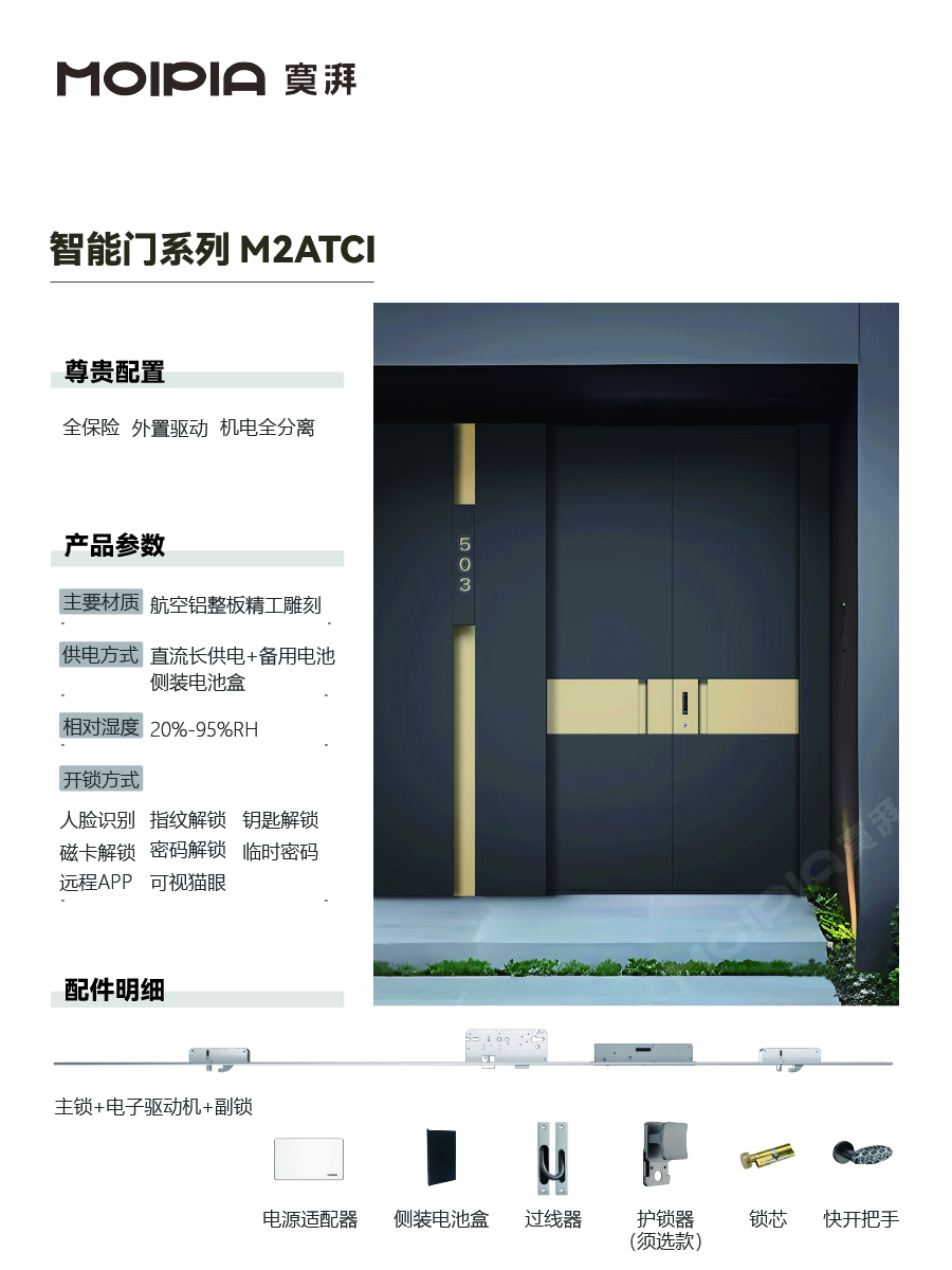 尊贵配置 全保险 外置驱动 机电全分离 产品参数 主要材质:航空铝整板精工雕刻 供电方式:直流长供电 + 备用电池 侧装电池盒 相对湿度:20%-95% RH 开锁方式:人脸识别 指纹解锁 钥匙解锁 磁卡解锁 密码解锁 临时密码 远程 APP 可视猫眼