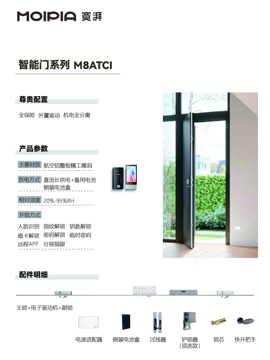 尊贵配置 全保险 外置驱动 机电全分离 产品参数 主要材质:航空铝整板精工雕刻 供电方式:直流长供电 + 备用电池 侧装电池盒 相对湿度:20%-95% RH 开锁方式:人脸识别 指纹解锁 钥匙解锁 磁卡解锁 密码解锁 临时密码 远程 APP 可视猫眼